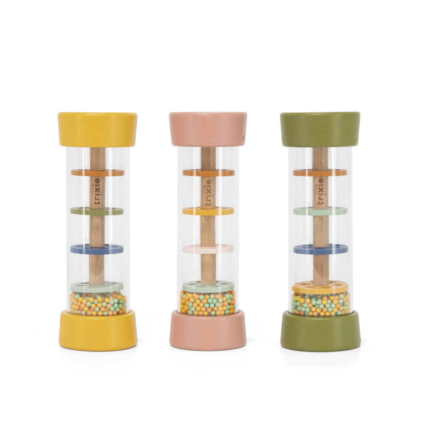 Der Regenmacher für Babys von der Marke Trixie bringt sanften Klang und leuchtende Farben ins Kinderzimmer. Wenn die kleinen Hände das Spielzeug kippen, rieseln funkelnde Perlen durch bunte Scheiben und erzeugen beruhigende Regengeräusche – fast wie echter Regen. So werden gleichzeitig die Sinne, das Gehör und die Motorik des Babys spielerisch gefördert.