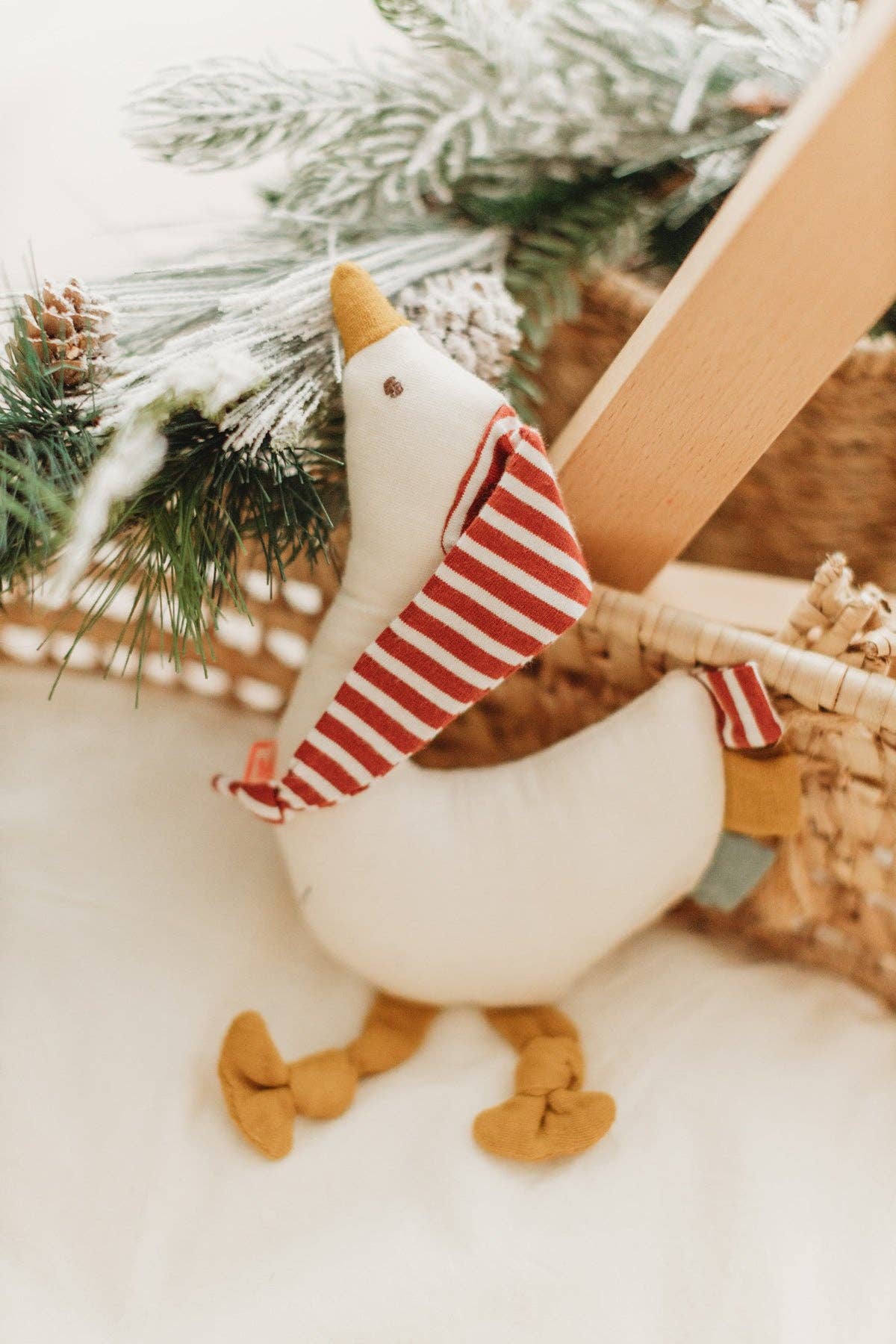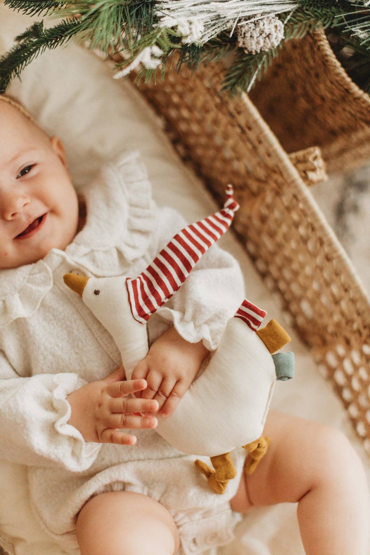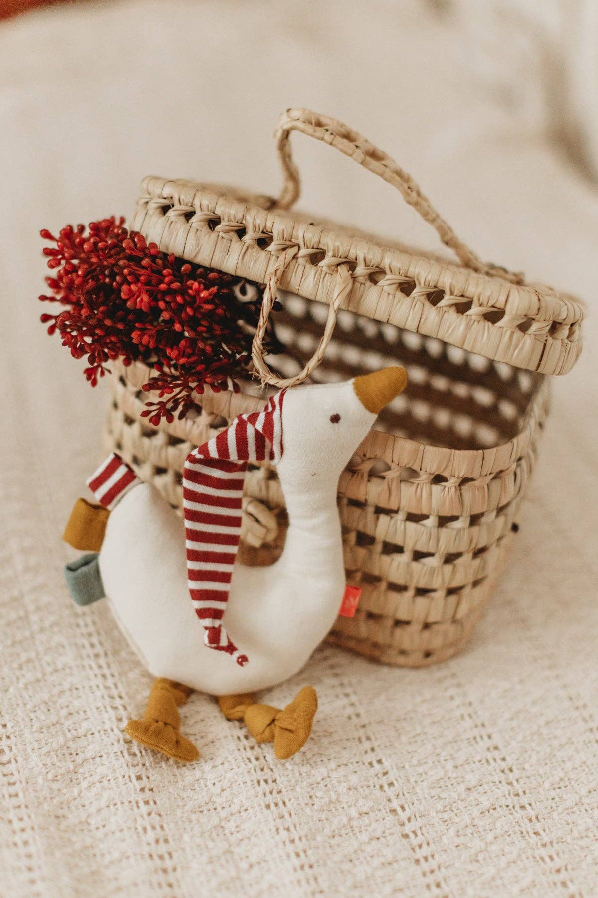Die Spielzeug-Gans von Kikadu ist ein liebevoll gestalteter Spielkamerad, der Kinderherzen im Nu erobert. Mit ihrer gestreiften Knister-Schlafmütze sorgt sie für spannendes Fühlen, Hören und Entdecken – perfekt, um die Sinne deines Babys spielerisch zu fördern. Beim Schütteln ertönt eine sanfte Rassel, die Neugier und Aufmerksamkeit weckt, während das weiche, kuschelige Material zum Greifen und Schmusen einlädt.