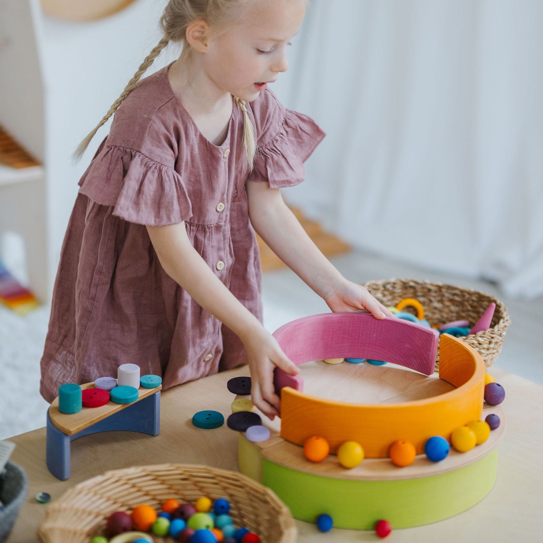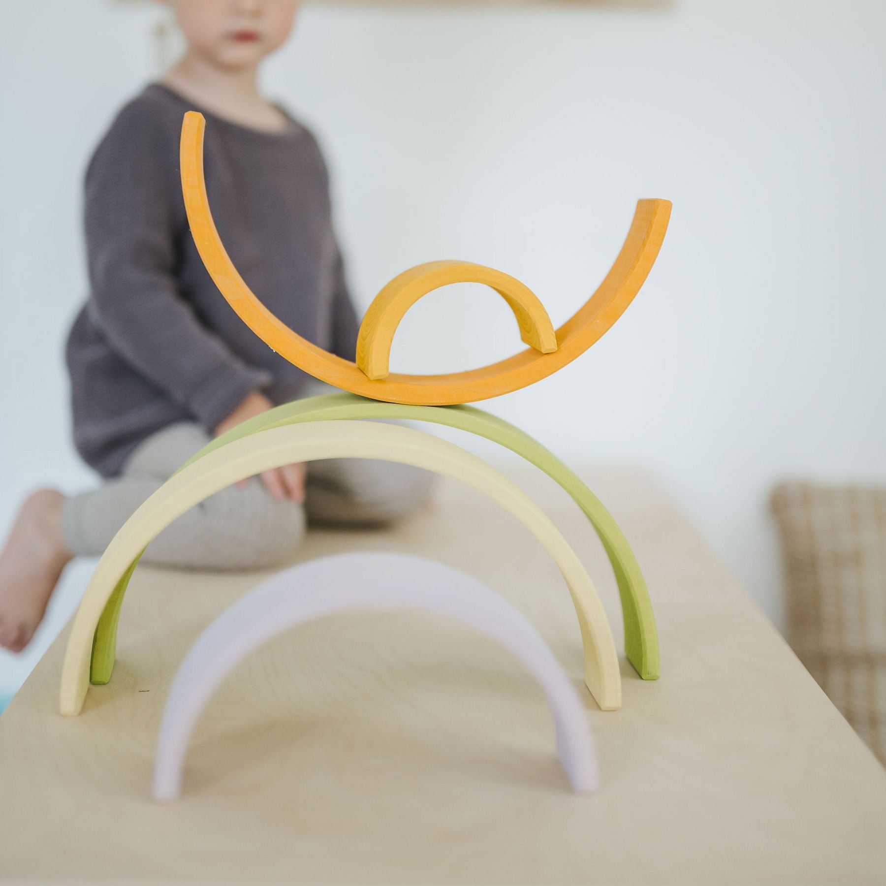 Die Bögen lassen sich zu Brücken, Tunneln, Puppenwiegen oder fantasievollen Skulpturen arrangieren und fördern so die Kreativität und Feinmotorik. Das natürliche Material und die harmonischen Farben sprechen die Sinne an und machen den Regenbogen auch zu einem dekorativen Element im Kinderzimmer.