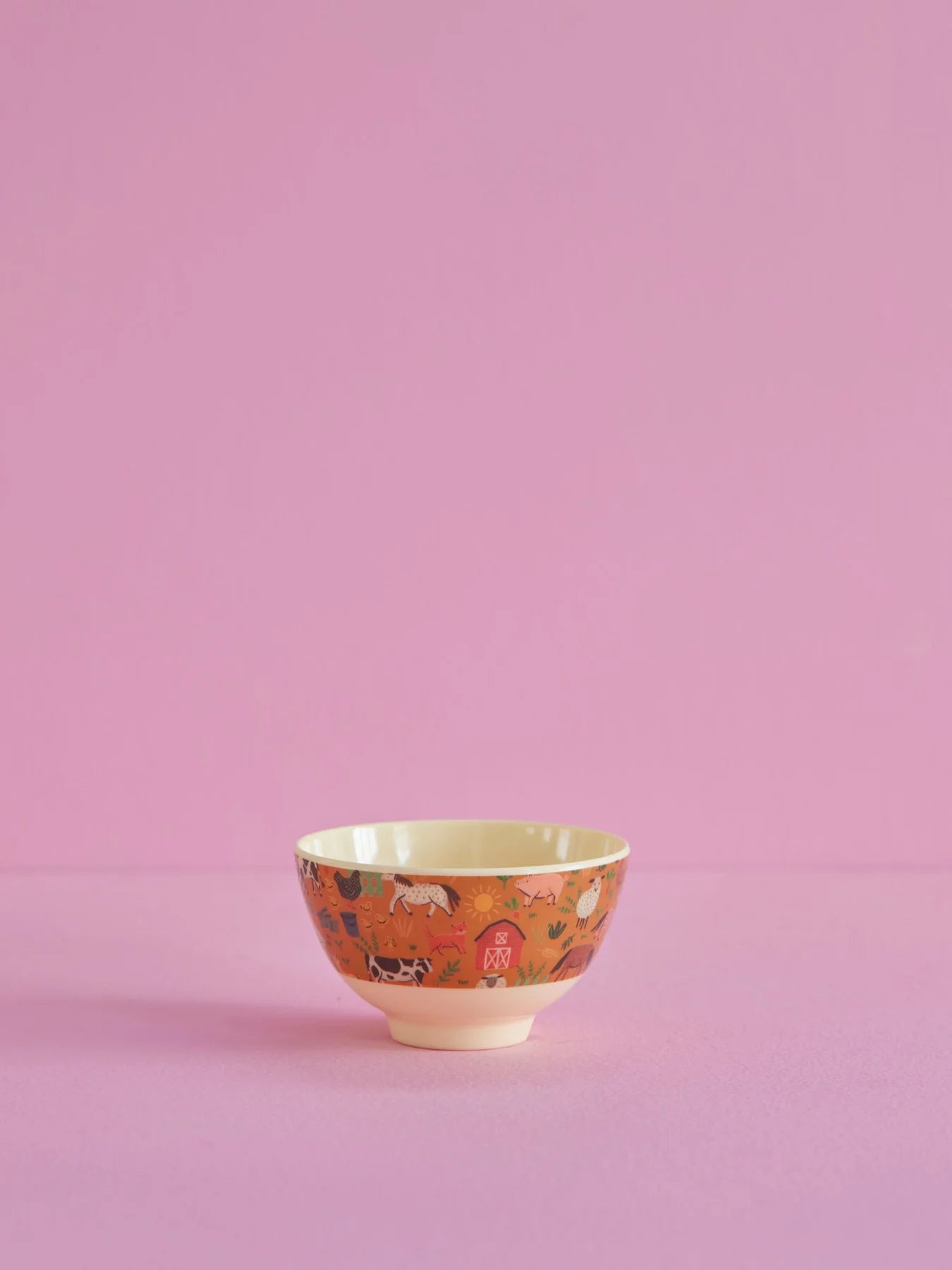 Diese kleine Schüssel "Farm Print" mit Bauernhof-Motiv von Rice ist ein wunderschönes und vielseitiges Utensil. Sie eignet sich perfekt für ein kleines Frühstück, Snacks oder zum Aufbewahren von Süßigkeiten. Die bunten Schmetterlinge auf rosa Hintergrund sorgen für gute Laune.