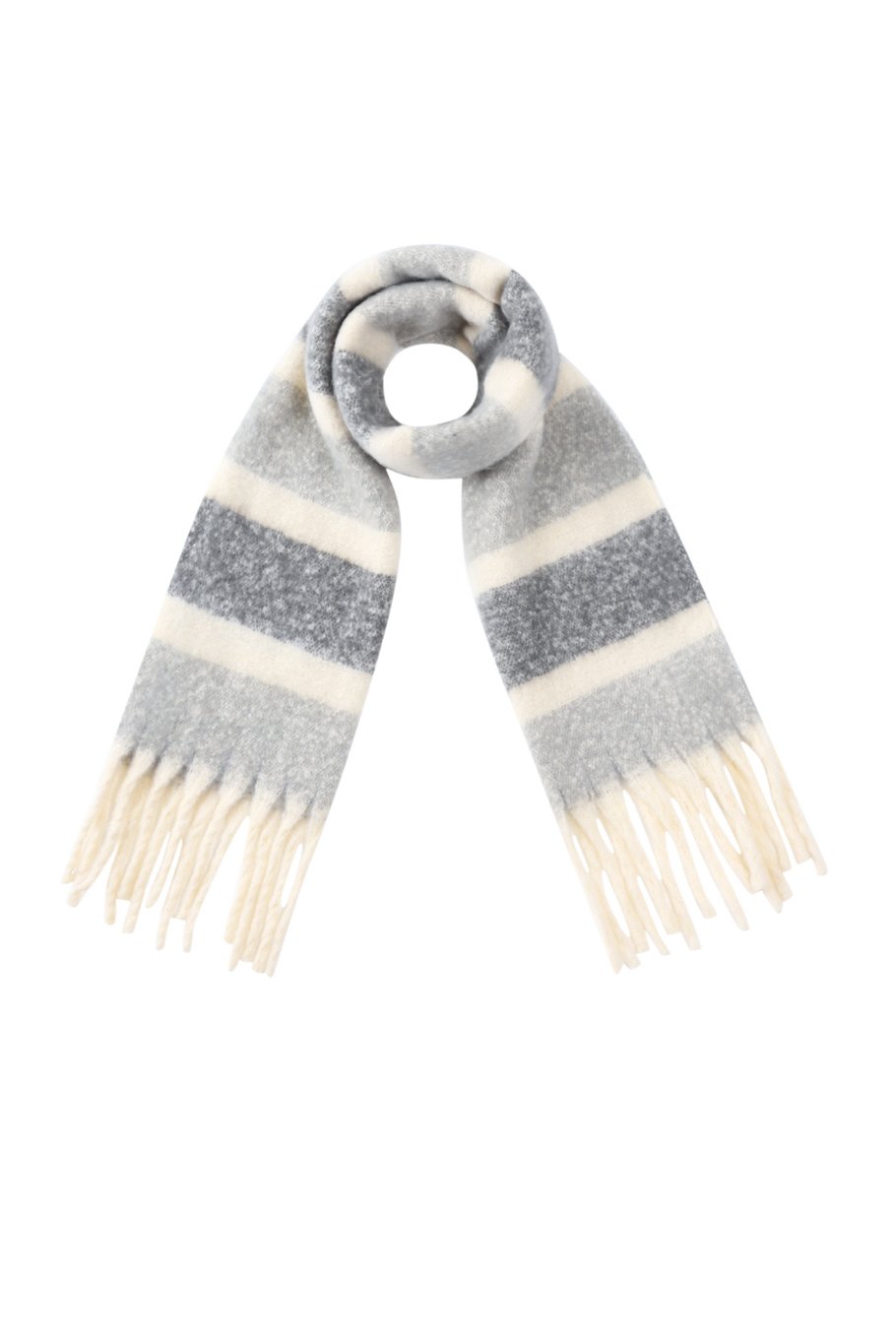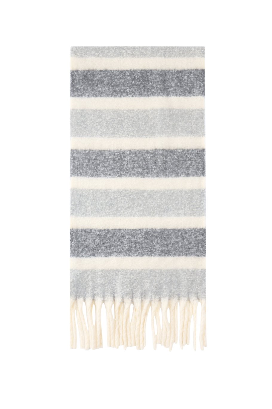 Das klassische Streifenmuster in Grau- und Cremetönen sowie die verspielten Fransenenden verleihen ihm eine zeitlose, elegante Note. Ob zu Mantel, Jacke oder als modisches Statement – dieser Schal ist vielseitig kombinierbar und hält dich zuverlässig warm.