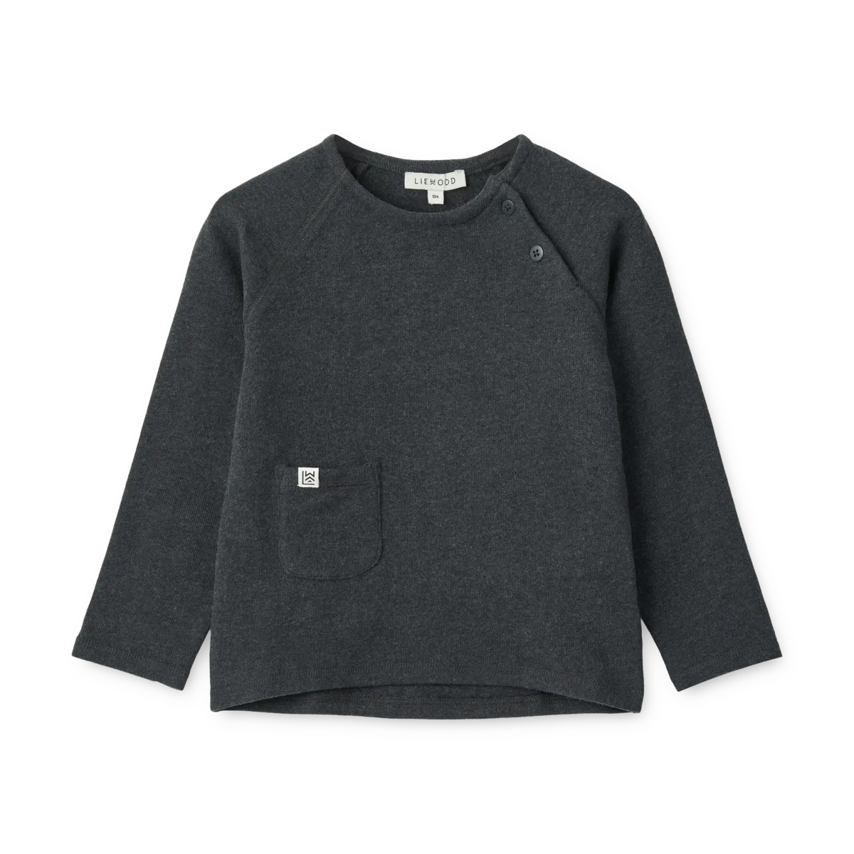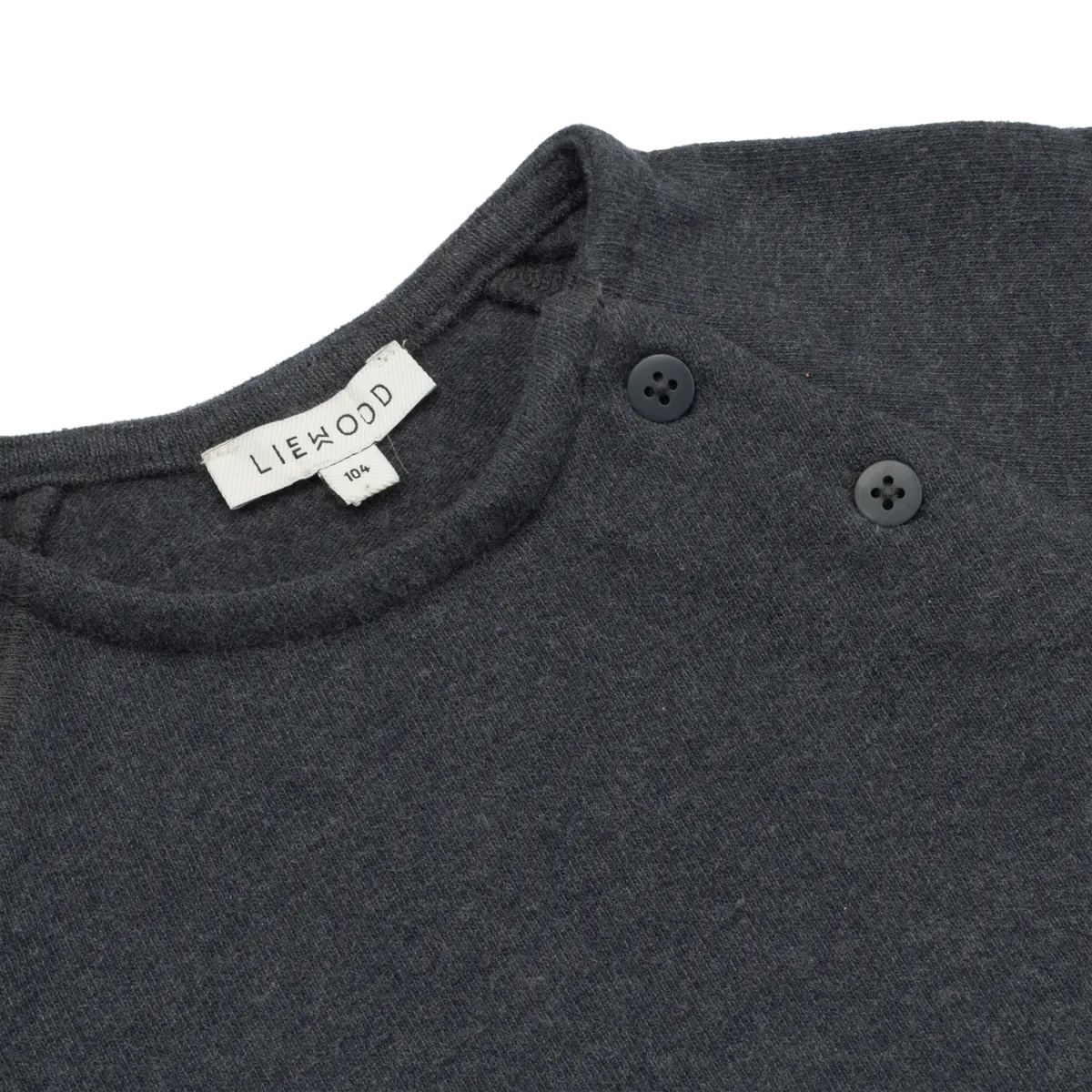 Das Dunkelgraue Oberteil "Lolan Top" von Liewood ist aus weichem Jerseystoff und somit perfekt ab Geburt geeignet. Mit einer kleinen Tasche, einer Schulteröffnung mit Knöpfen, langen Ärmeln und einem längeren Rücken ist es aber auch für ältere Kind ein tolles Basic-Kleidungsstück für den Kleiderschrank.