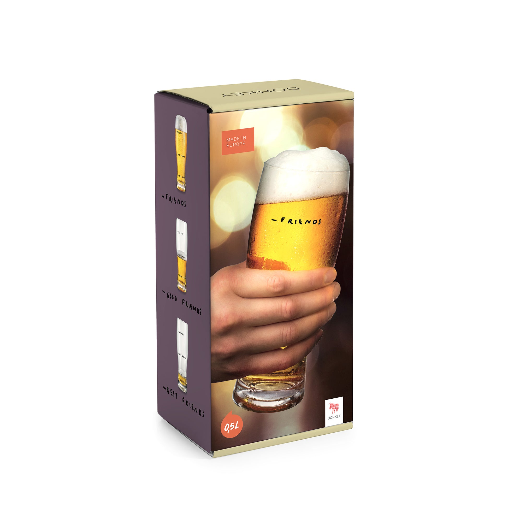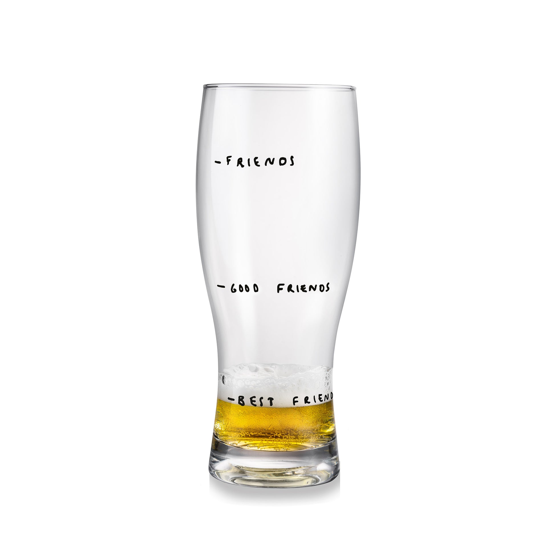 Das Bierglas mit Schriftaufdruck ist das perfekte Geschenk für Freunde und wird für noch mehr Geselligkeit sorgen. Mit einer Füllmenge von 500 ml und einer Höhe von 19,5 cm ist es ein robustes Glas, an dem man sehr lange Freude hat. Die Skala auf dem Glas wechselt mit sinkender Füllhöhe von "Friends" über "Good Friends" zu "Best Friends", was für eine lustige Stimmung sorgt.