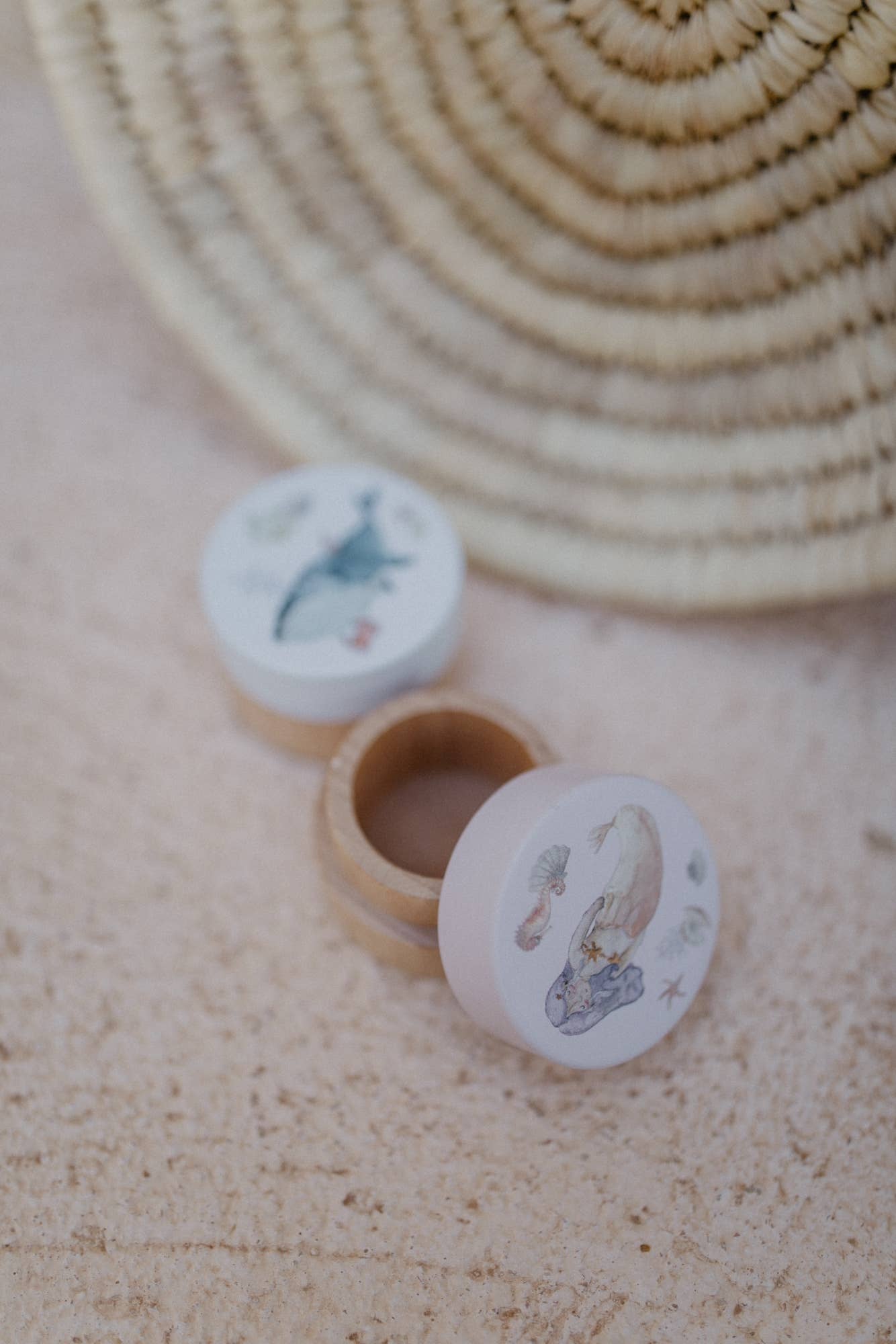 Die kleine Holzdose lässt sich durch eine sanfte Drehbewegung leicht öffnen und schließen und überzeugt durch ihr zartes, handgezeichnetes Meeresmotiv. Das schlichte Design fügt sich wunderbar in jedes Kinderzimmer ein und macht die Dose zu einem besonderen Erinnerungsstück für Eltern und Kinder gleichermaßen.