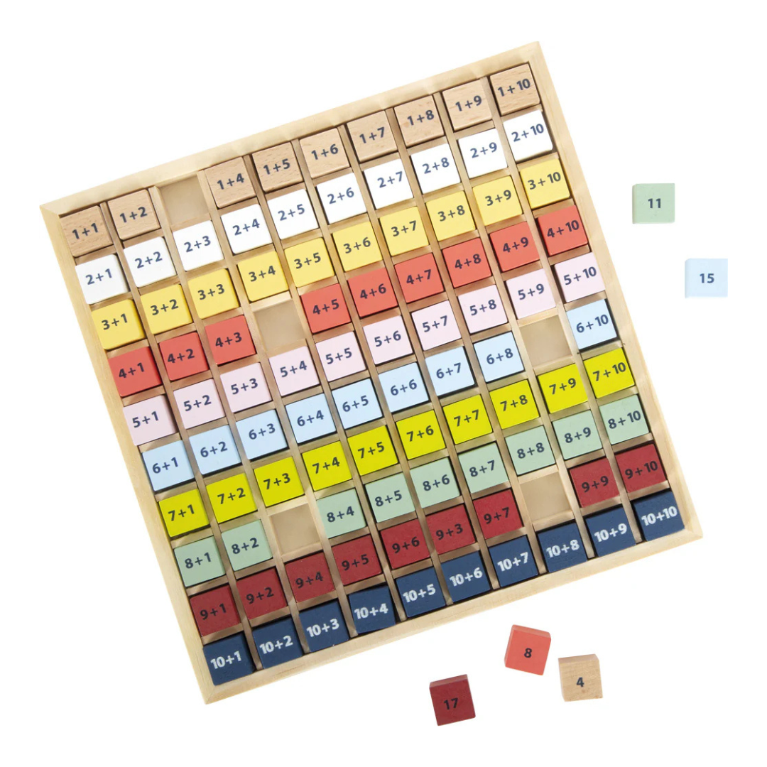 Mit diesem Rechenbrett können Kinder auf spielerische Weise das Addieren üben und mathematische Zusammenhänge verstehen. Die Aufgabe ist einfach: Jede Rechenaufgabe wird auf einem farbenfrohen Würfel präsentiert, und die Lösung befindet sich auf der Rückseite. Das aus robustem, FSC®-zertifiziertem Holz gefertigte Brett sorgt dafür, dass die Würfel sicher an Ort und Stelle bleiben, sodass Kinder sich voll und ganz auf das Lernen konzentrieren können. Es fördert nicht nur mathematische Kenntnisse, sondern auch die Feinmotorik.