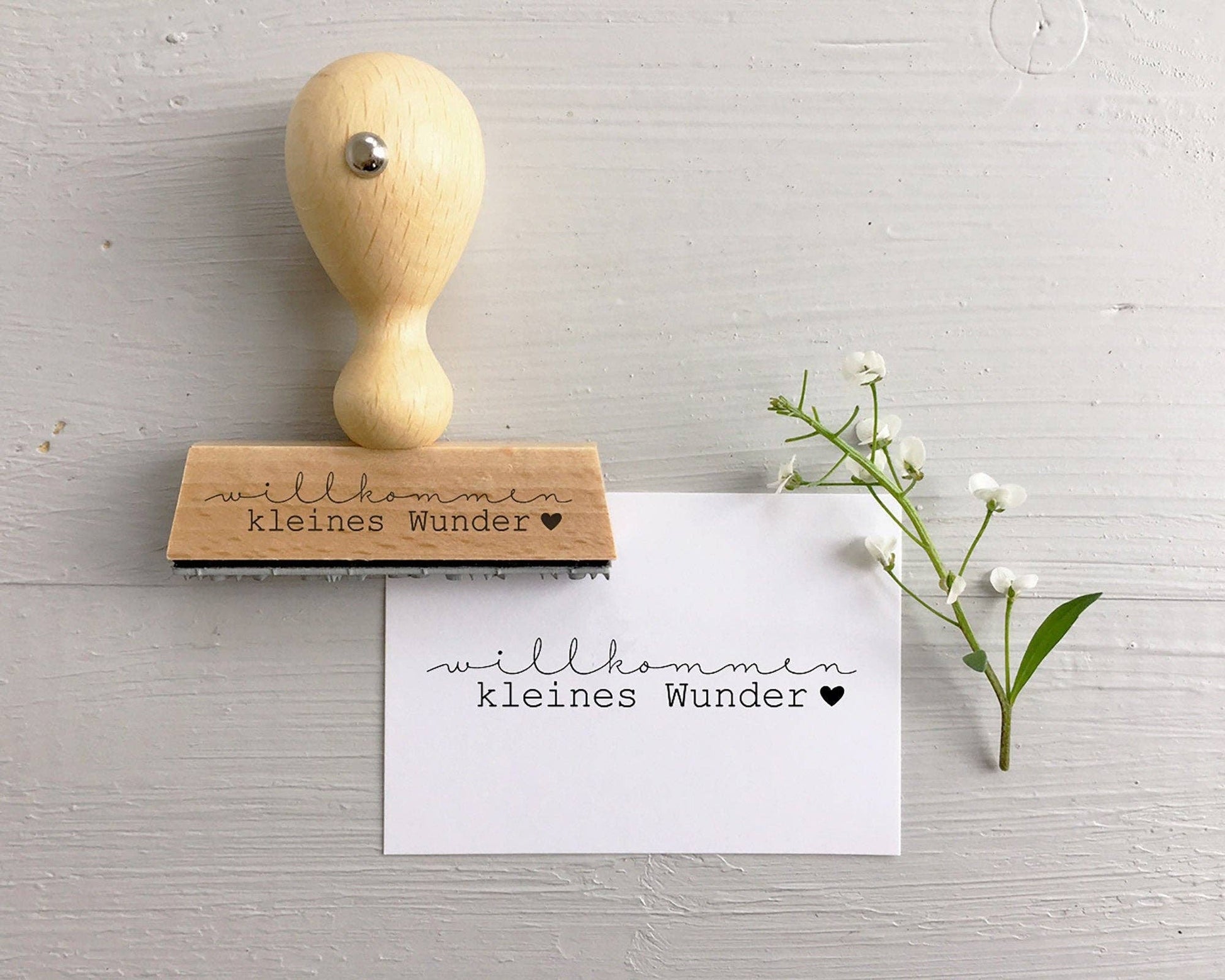 Der liebevoll gestaltete Stempel "Willkommen kleines Wunder" ist perfekt für die Gestaltung von individuellen Geburtskarten, Dankeskarten und Glückwunschkarten zum Baby. Mit dem zarten Herz-Motiv und einer Größe von ca. 5 x 1 cm ist er ideal kombinierbar mit anderen Motivstempeln.