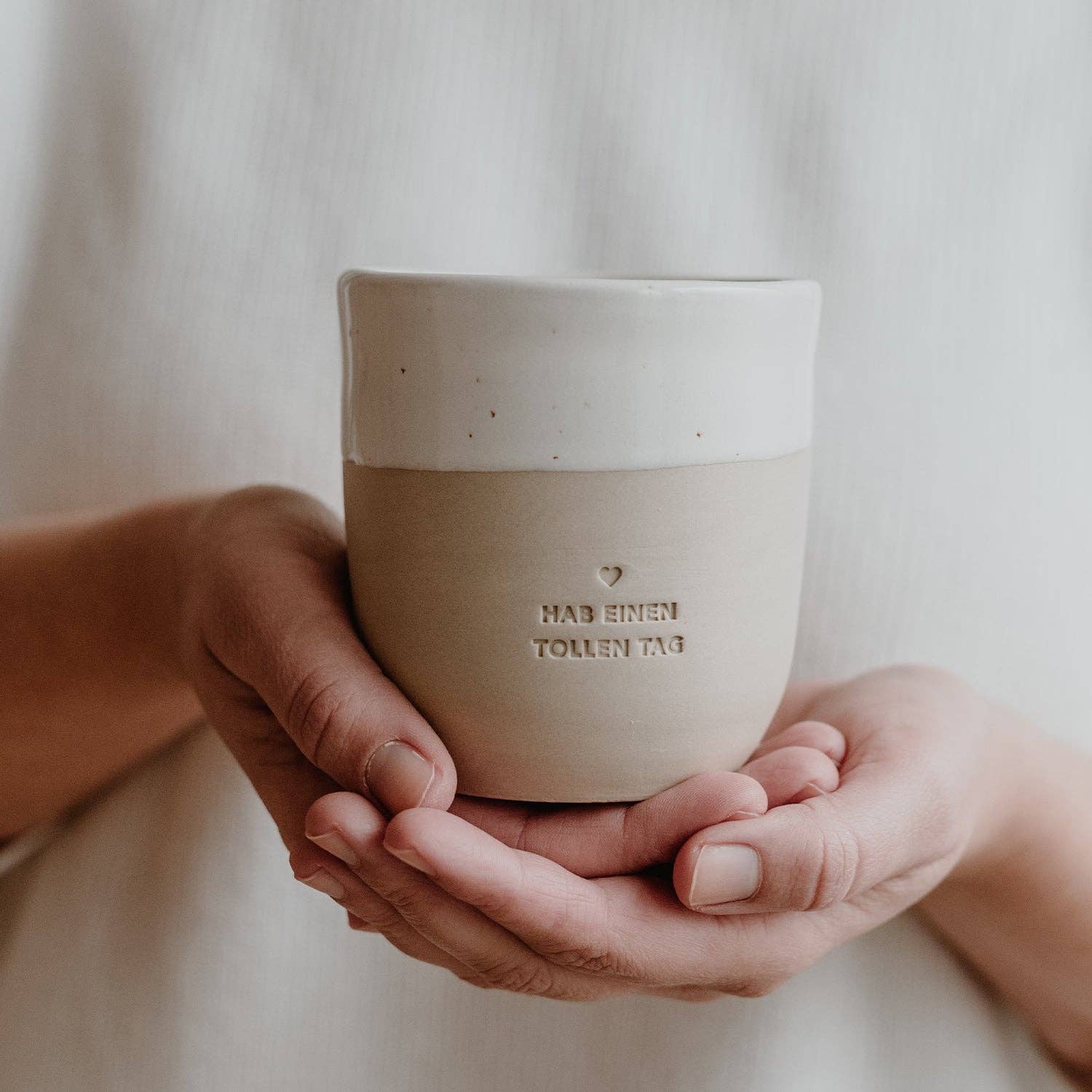 Der Steingut Becher "Hab einen tollen Tag" von Eulenschnitt ist eine liebevolle Erinnerung daran, den Tag mit einem Lächeln zu beginnen. Mit seiner schlichten, zeitlosen Form und der handgeschrieben wirkenden Botschaft sorgt er schon am Morgen für gute Laune – perfekt für Kaffee, Tee oder Kakao.