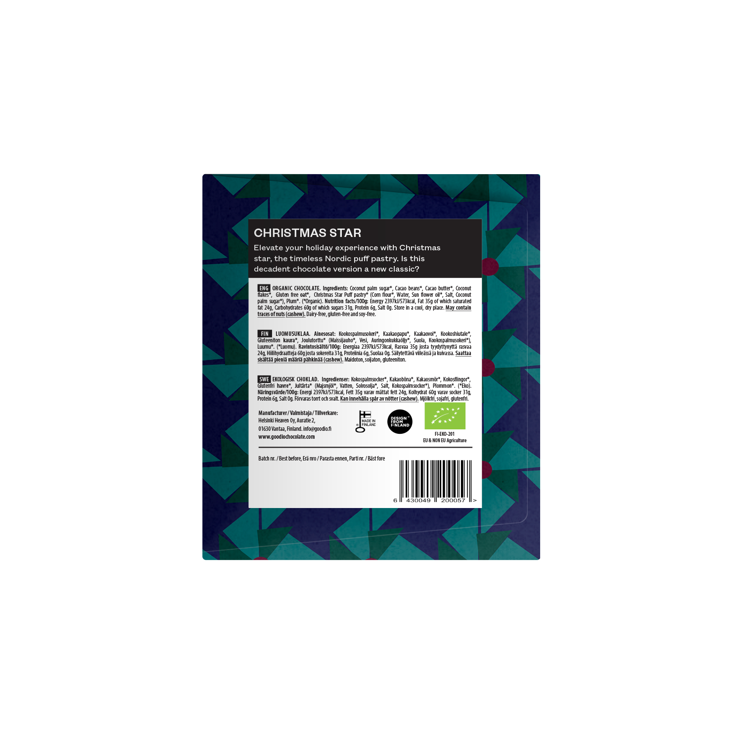 Erleben Sie ein Stück nordische Weihnacht mit der „Weihnachtsstern“-Schokolade von Goodio Chocolate – einer handgefertigten Köstlichkeit aus Finnland, dem glücklichsten Land der Welt. 🇫🇮✨ Diese besondere Tafel kombiniert den Geschmack des traditionellen nordischen Weihnachtssterns aus Blätterteig mit edler Schokolade, Pflaume und Kokosflocken – ein Fest für alle Sinne.